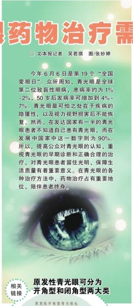 今年6月6日是第19个“全国爱眼日”。众所周知,青光眼是全球第二位致盲性眼病,患病率约为1%~2%,50岁后发病率可增加到4%~7%。青光眼最可怕之处在于疾病的隐匿性,以及视力视野损害后不能恢复。然而,在发达国家有一半的青光眼患者不知道自己患有青光眼,而在发展中国家中这一数字则为90%。所以,提高公众对青光眼的认知,重视青光眼的早期诊断和正确合理的治疗,对青光眼患者留住光明、保障生活质量有着重要意义。在青光眼的各种治疗方法中,药物治疗占有重要地位,陪伴患者终身。