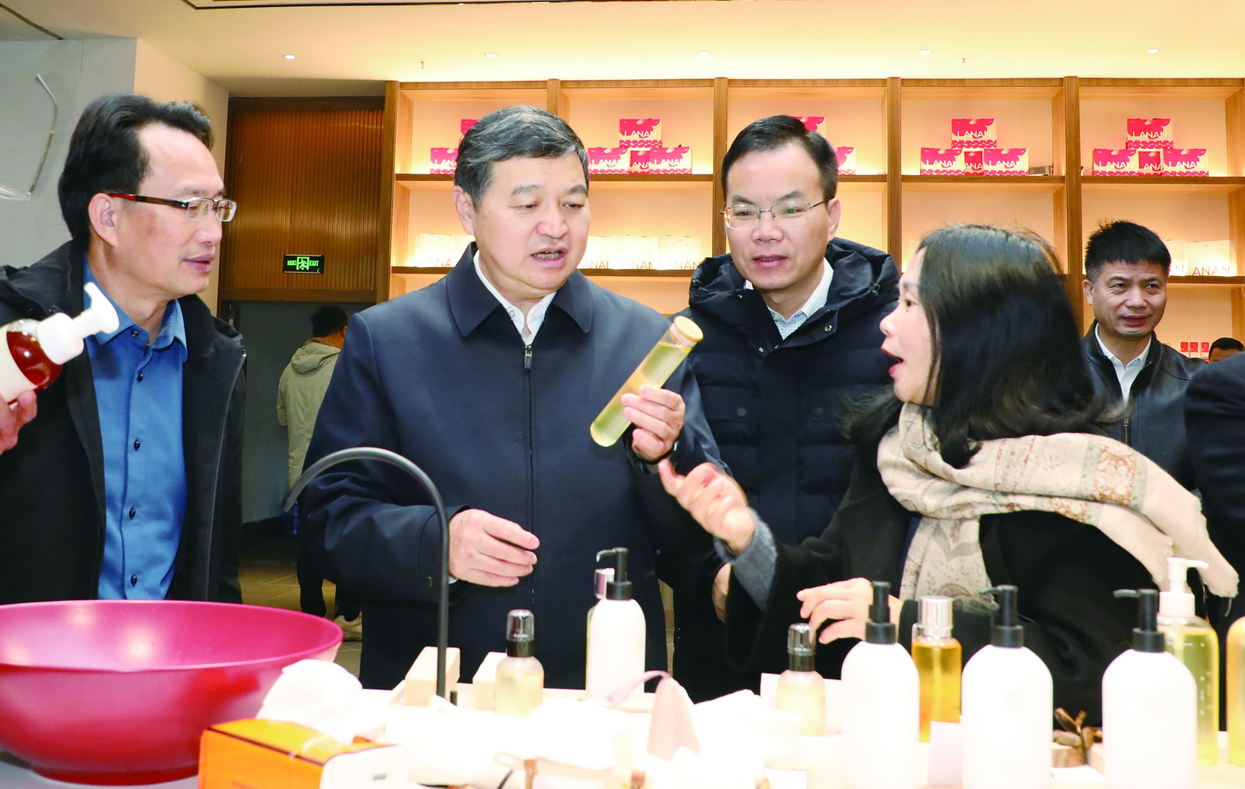 图为该局工作人员在当地一家承担乡村振兴项目的化妆品生产企业,了解油茶全产业链发展和相关化妆品研发情况。