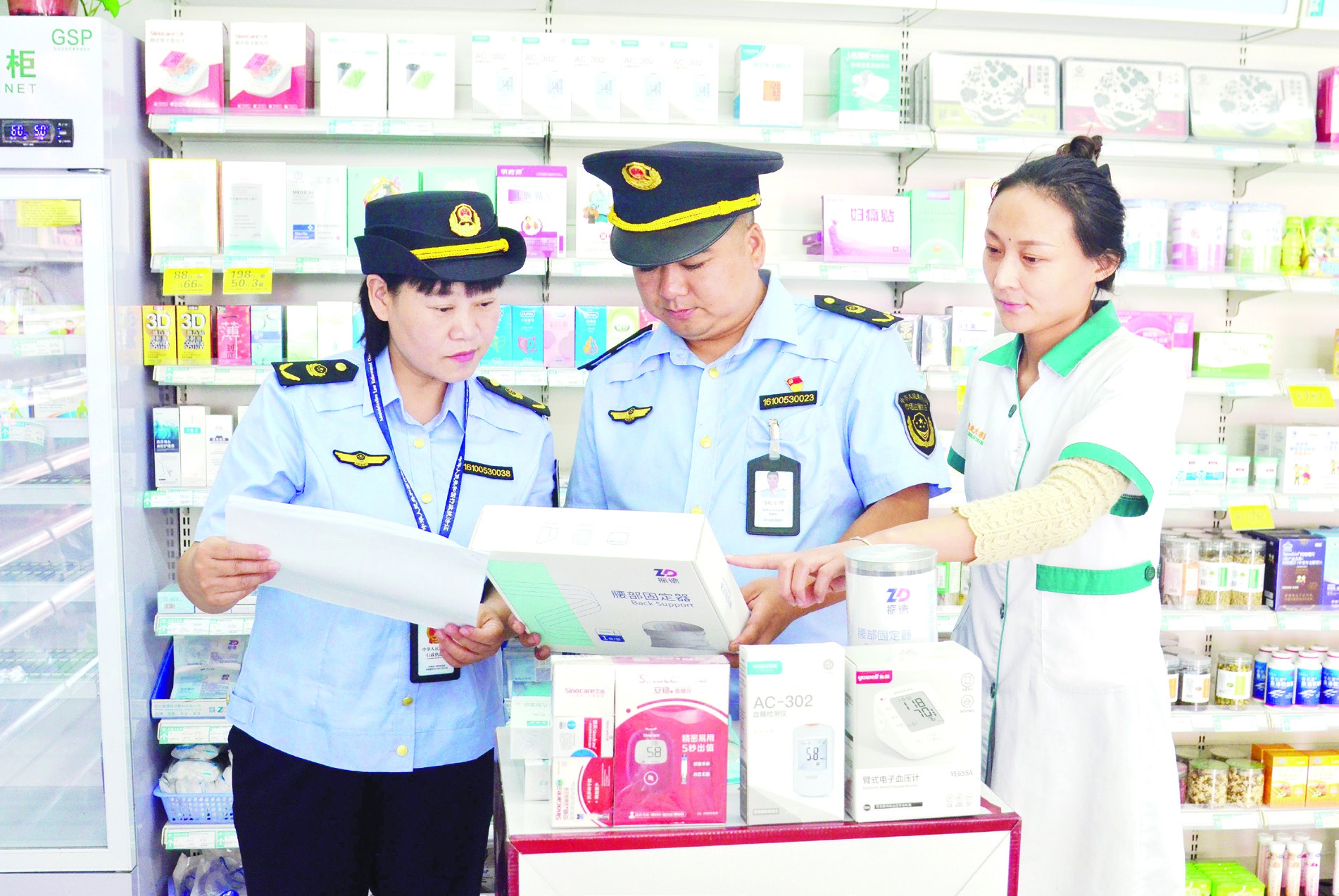 图为禹州市褚河市场监管所的监管人员在一家药店检查医疗器械质量安全情况。