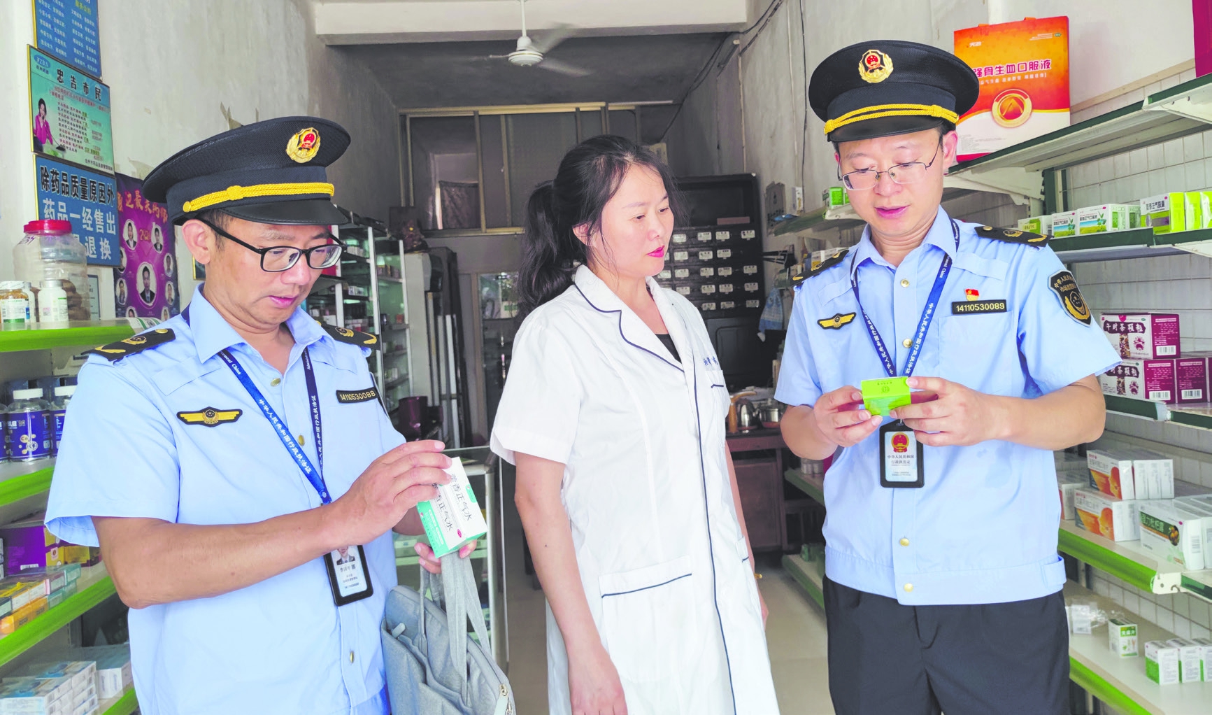图为该局监管人员在一家药店检查药品效期合规情况。