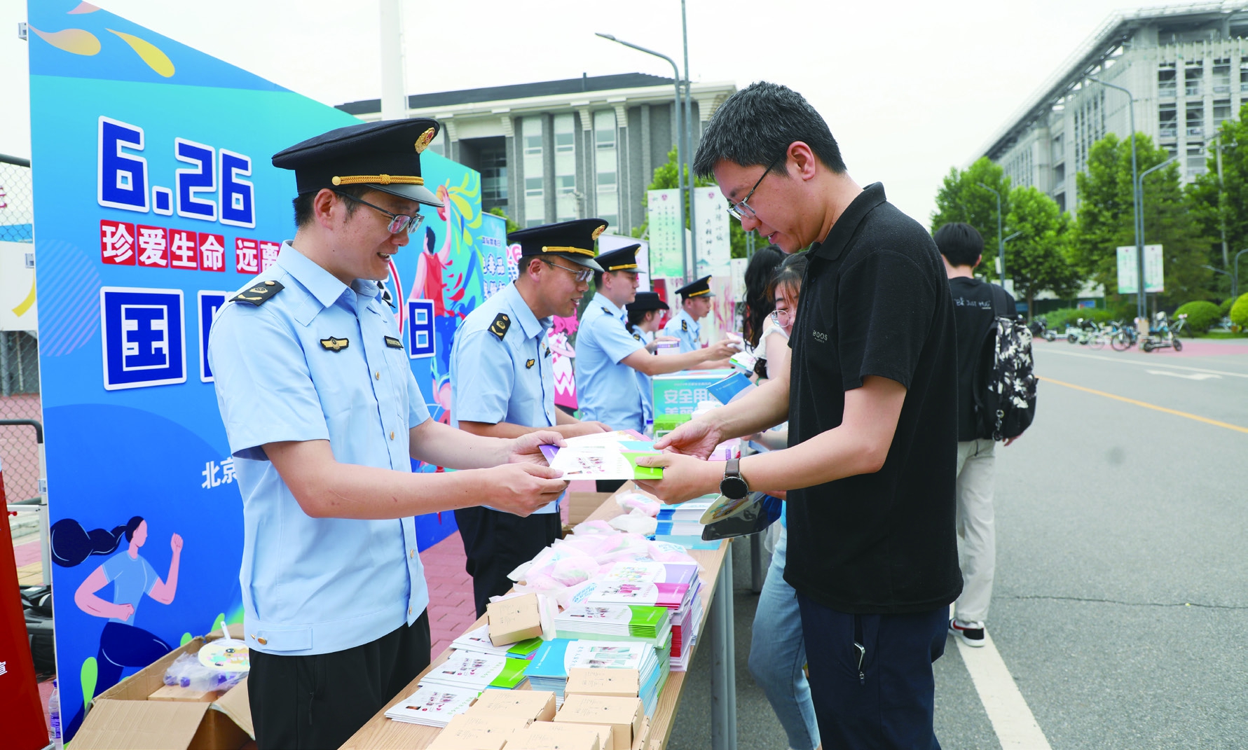 图为国际禁毒日当天,北京市药监局第一分局监管人员在北京中医药大学开展禁毒宣传。