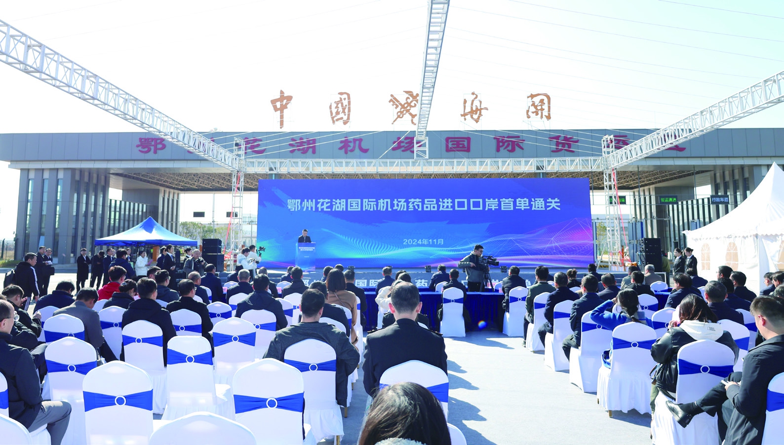 ▲2024年10月30日,鄂州花湖国际机场口岸获准进口全球药品。图为首单进口药品通关仪式。湖北省药监局供图