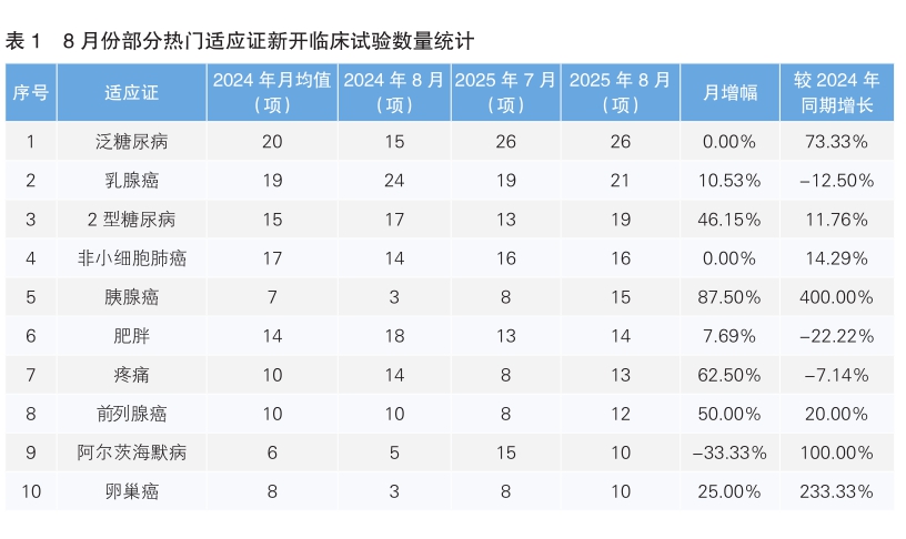从8月份新开临床试验热门适应证来看,泛糖尿病为最主要的热门研发领域,新开临床试验数量为26项,与7月份持平,相较于去年同期上涨73.33%。其次为乳腺癌,新开临床试验21项,环比上升10.53%,同比下降12.50%。值得注意的是,8月份新开临床试验数量上升幅度最大的热门适应证为胰腺癌,环比上升87.50%,同比上涨400.00%;下降幅度最大的适应证为阿尔茨海默病,由7月份的15项下降为10项,下降幅度为33.33%。(详见表1)