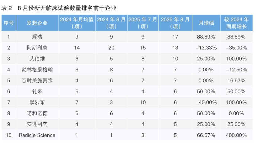 对新开临床试验的发起企业进行统计后发现,8月份发起临床试验最多的企业为辉瑞,新开临床试验17项,环比和同比均上升了88.89%。其次为阿斯利康,新开临床试验13项,环比下降13.33%,同比下降35.00%。值得注意的是,8月份美国Radicle Science公司首次进入新开临床试验数量排名前十企业榜单,新开临床试验5项。(详见表2)