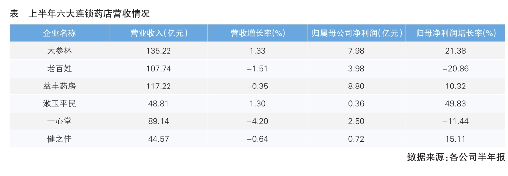 日前,益丰药房、大参林、健之佳、漱玉平民、一心堂、老百姓6家上市连锁药店(以下简称六大连锁)陆续发布2025年半年报。