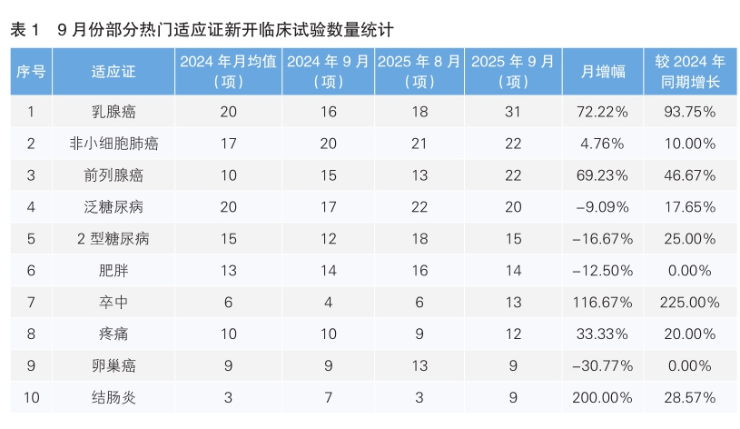 从9月份新开临床试验热门适应证来看,乳腺癌为最主要的热门研发领域,新开临床试验31项,环比上涨72.22%,同比上涨93.75%。其次为非小细胞肺癌,新开临床试验22项,与去年同期相比上涨10.00%。值得注意的是,9月份新开临床试验数量上升幅度最大的热门适应证为结肠炎,由8月份的3项上升至9项,上升幅度为200.00%;数量下降幅度最大的适应证为卵巢癌,由8月份的13项下降到9项,下降幅度为30.77%。(详见表1)