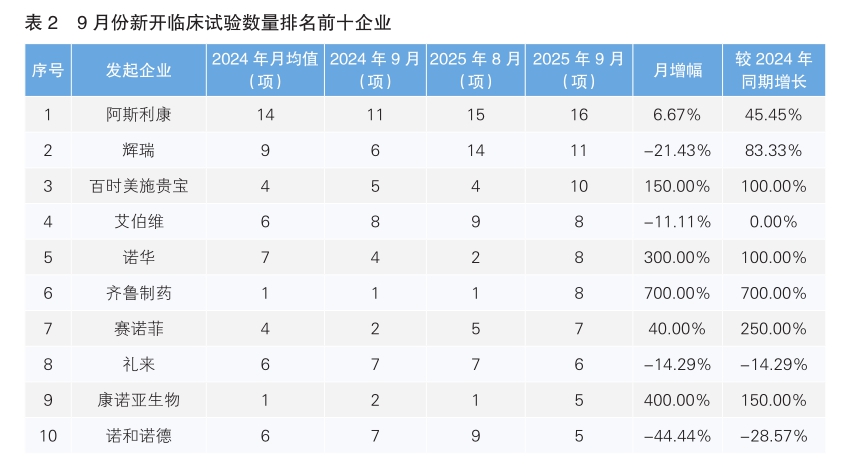 9月份新开临床试验数量排名前三的企业分别为阿斯利康、辉瑞和百时美施贵宝,数量分别为16项、11项、10项。