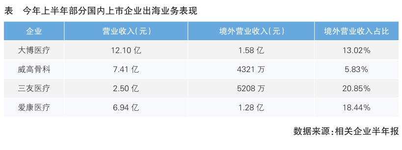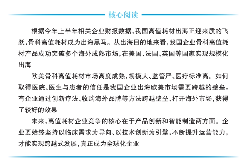 在创新药领域,以BD(商务拓展)交易增多代表着行业跃迁。对于商业化周期更短的医疗器械,行业中含金量最高的高值耗材出海,则能直接印证行业复苏和竞争力的增长。根据今年上半年相关企业财报数据,我国高值耗材出海正迎来质的飞跃,骨科高值耗材成为出海黑马。