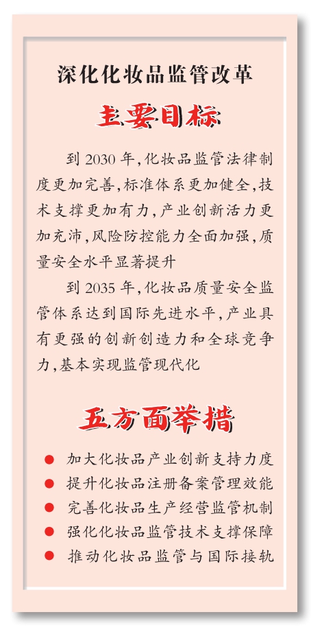本报北京讯 (记者蒋红瑜) “美丽经济”迎来政策“大礼包”。11月17日,《国家药监局关于深化化妆品监管改革促进产业高质量发展的意见》(以下简称《意见》)发布。《意见》明确了到2030年、到2035年的改革目标,并提出加大化妆品产业创新支持力度、提升化妆品注册备案管理效能等5方面24条改革举措,引起业界关注。