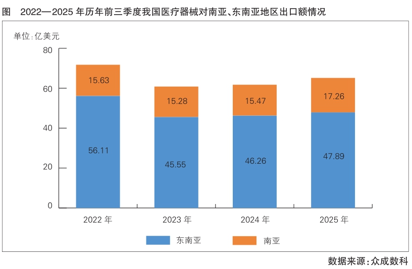 在出口额方面,今年前三季度,我国医疗器械对两亚地区出口总额达65.14亿美元,同比增长5.5%。其中,南亚地区为17.26亿美元,同比增长11.6%;对东南亚地区的医疗器械出口额为47.89亿美元,同比增长3.5%。(详见图)
