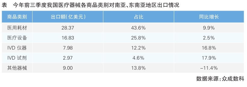 今年前三季度,我国医疗器械出口两亚地区的商品类别中,医用耗材以43.6%的品类占比稳居第一,且同比增长接近10%;其次是医疗设备,占比25.8%;IVD(体外诊断)仪器和IVD试剂合计占16.8%,增速均超两位数,分别为16.8%和17.9%;其他器械(主要为按摩器具、未列名钢铁制卫生器具等)则呈下降趋势。(详见表)
