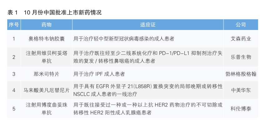 10月份,我国共批准5款新药上市。根据Pharmadigger数据库,除那米司特片外,其余4款均为我国企业自主研发的全球范围内首次获批上市的新药(详见表1)。