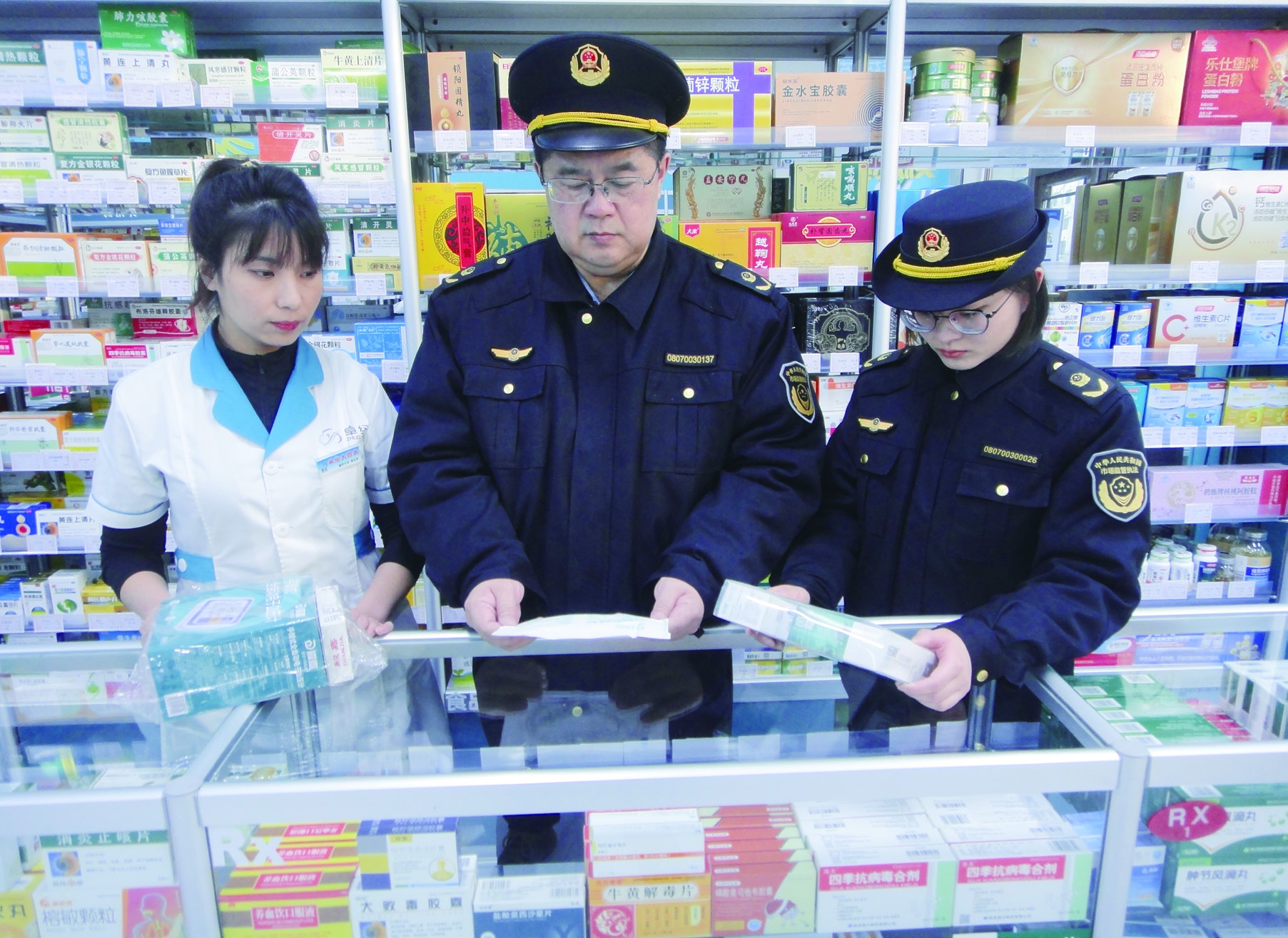 图为该局监管人员在一家药店检查医疗器械的标签标识。