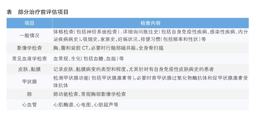 使用PD-1/PD-L1抑制剂治疗之前,建议进行治疗前评估(详见表),包括严格的体格检查、实验室检查和影像学检查,并以此作为治疗过程中出现异常情况的参考。
