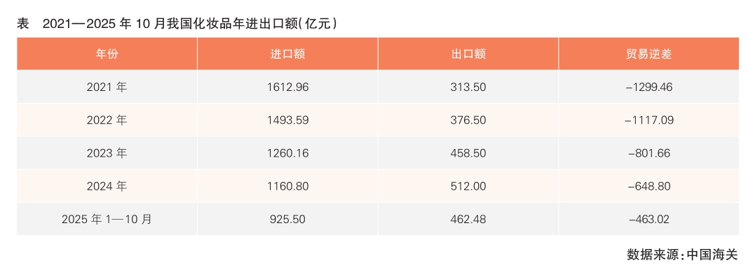 从整体进出口数据来看,我国化妆品贸易逆差持续收窄,进出口格局更加均衡。此前长期存在的贸易逆差不断缩小,中国海关发布的化妆品进出口数据显示,2021年我国化妆品进口额高达1612.96亿元,但出口额仅为313.5亿元,贸易逆差高达1299.46亿元。随着我国化妆品出口的持续发力与进口的理性调整,“出口量价齐升、进口量升额降”的格局逐渐显现。2025年1—10月,贸易逆差已经缩小至463.02亿元。