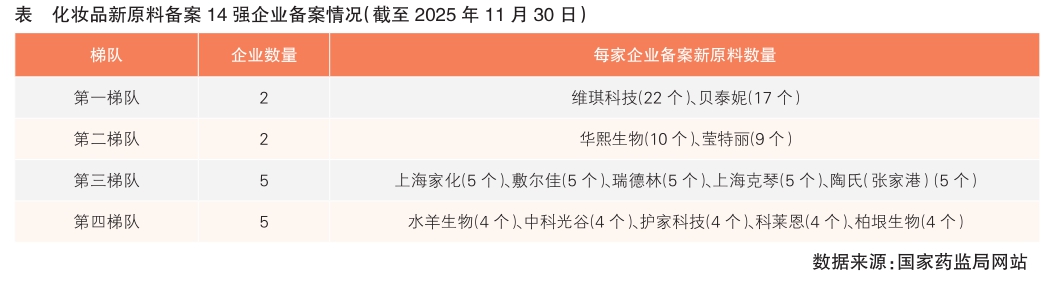国家药监局数据显示,截至2025年11月30日,我国化妆品新原料备案总量已达330余个,其中2025年新增备案达149个,充分显示行业创新加速。从企业备案分布看,14家头部企业(备案数≥4个的企业)形成四大梯队竞争格局(详见表)。