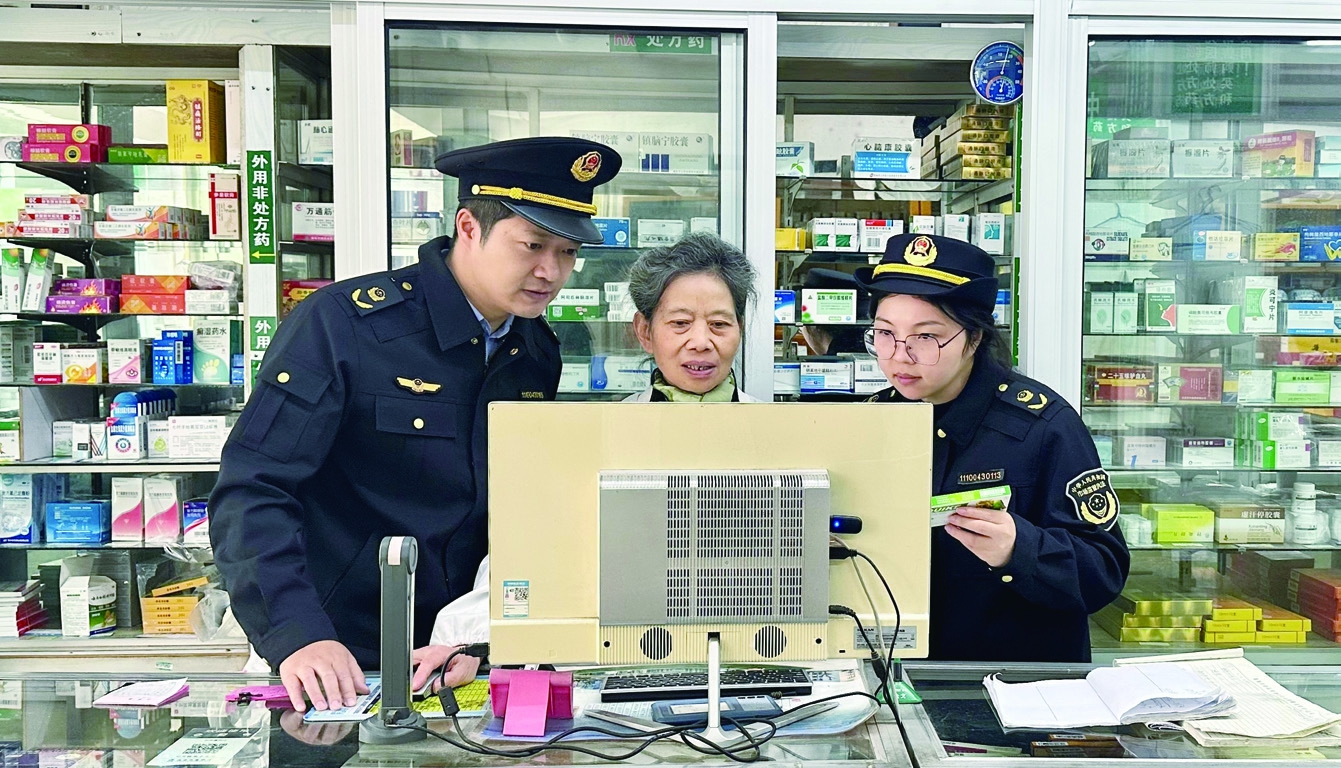 图为“清源”行动中,临海市市场监管局监管人员在一家零售药店查看处方药销售记录。临海市市场监管局供图