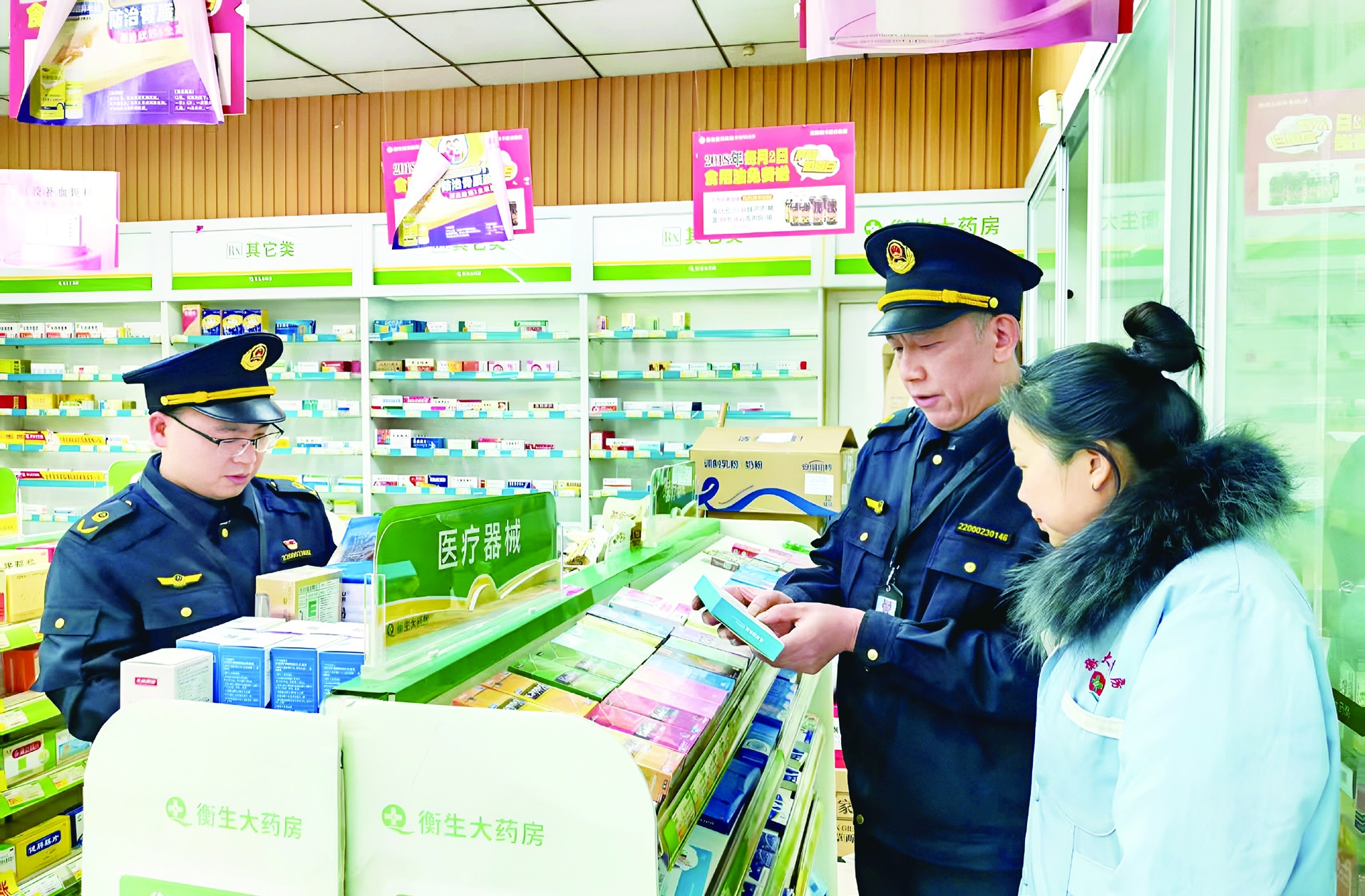 图为该局监管人员在一家药店检查医疗器械效期管理是否规范。