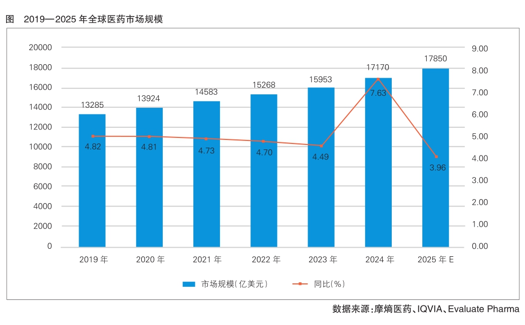 由于全球人口增长、老龄化加速、健康需求释放和新兴市场崛起等因素,全球医药市场规模由2019年的13285亿美元,增至2024年的17170亿美元。2025年,叠加创新药上市节奏加快及新兴市场医疗保障体系逐步完善带动的需求增长等因素,全球医药市场规模增至17850亿美元(详见图)。