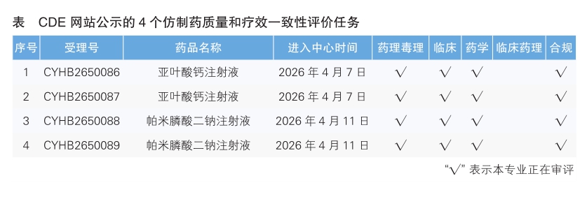 7.CDE网站公示4个仿制药质量和疗效一致性评价任务(详见表),涉及亚叶酸钙注射液等品种。